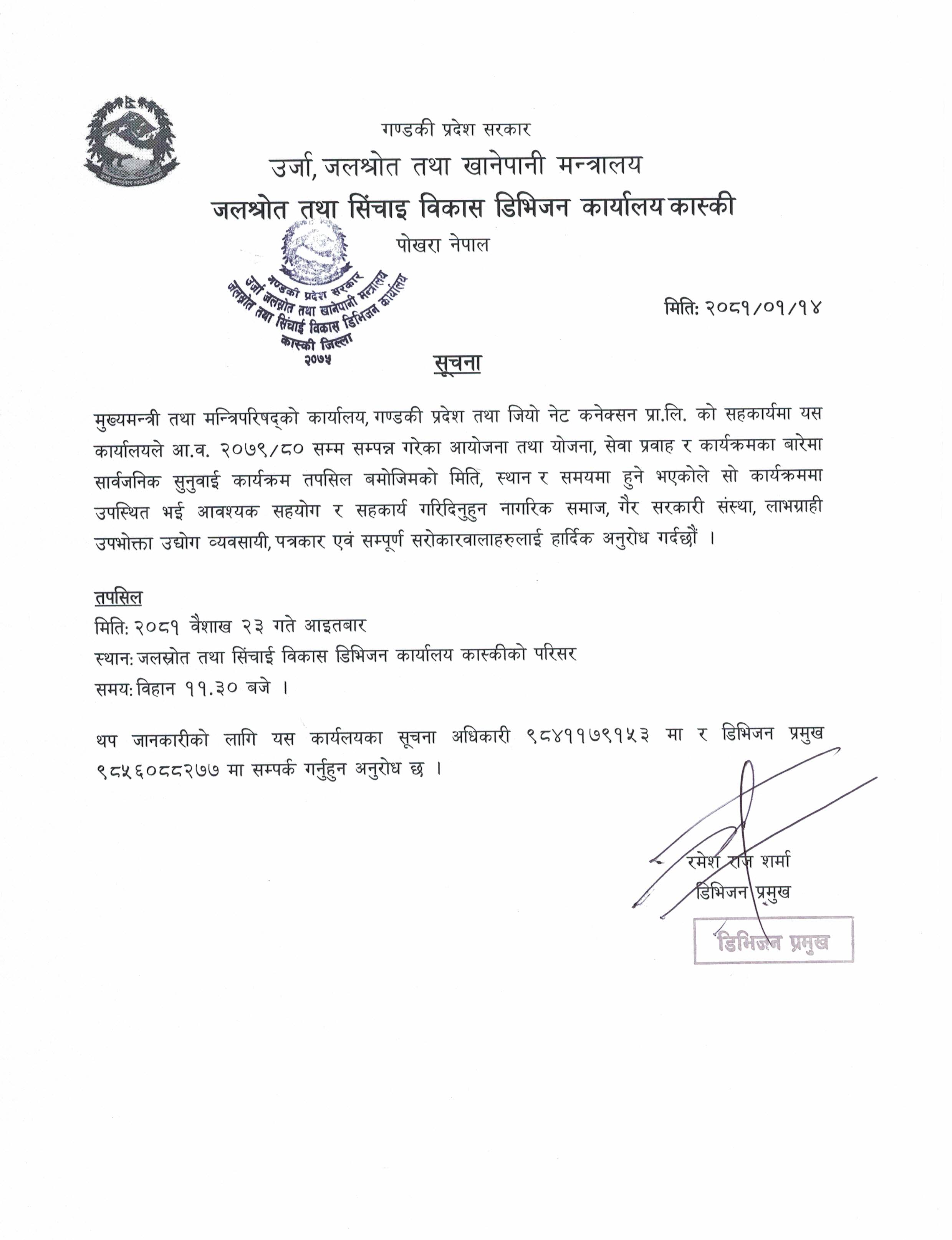 © सर्वाधिकार सुरक्षित जलस्रोत तथा सिंचाई विकास डिभिजन कार्यालय, कास्की